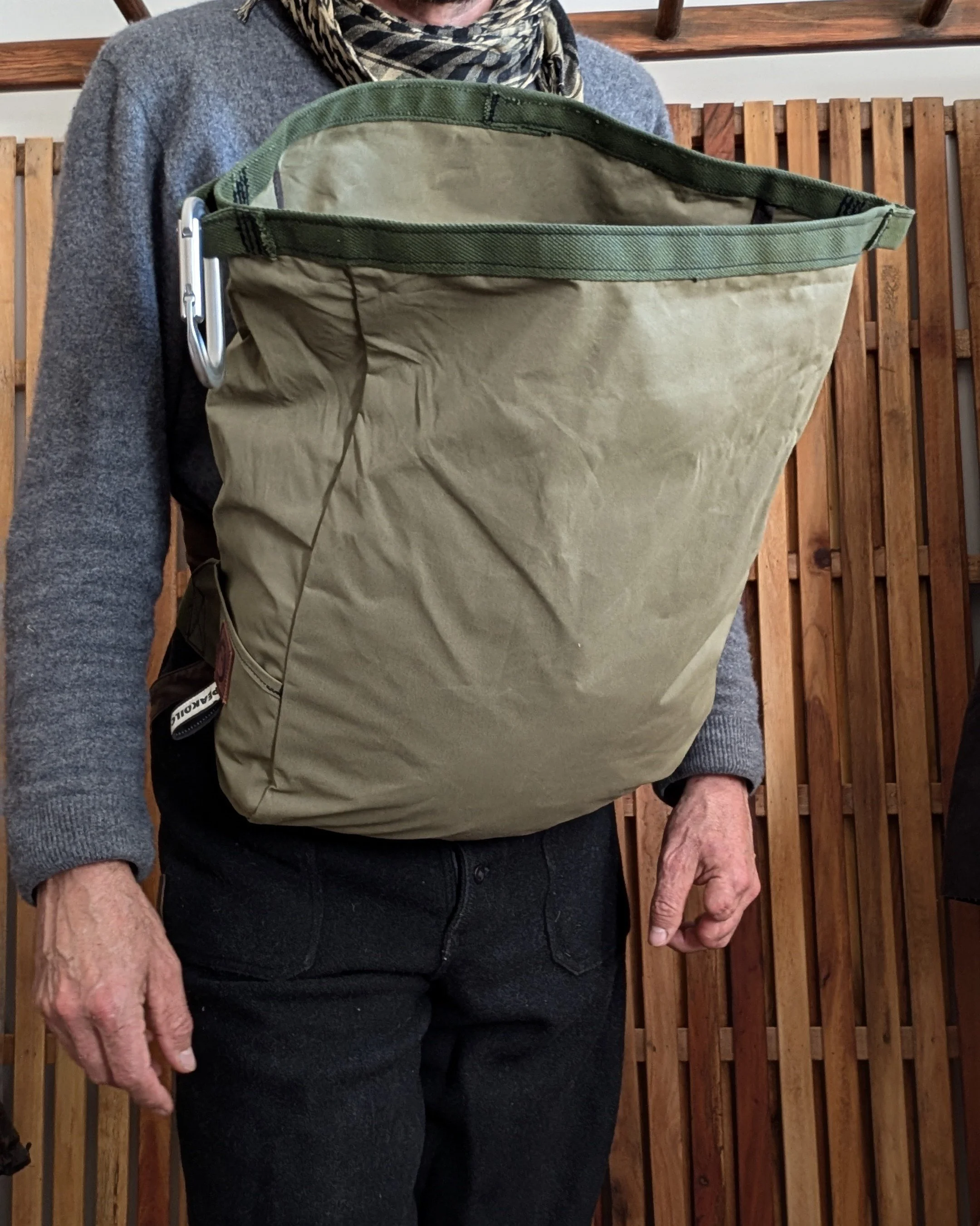 The roll top is the most secure and versatile opening, with no zips to fail, expandable size and easy reconfiguration for different carries. The carrying capacity is large or small. It can fit a change of clothes with woollens, or a waxed canvas shell layer and sweater, or a range of handy grab items and a sheepskin vest.