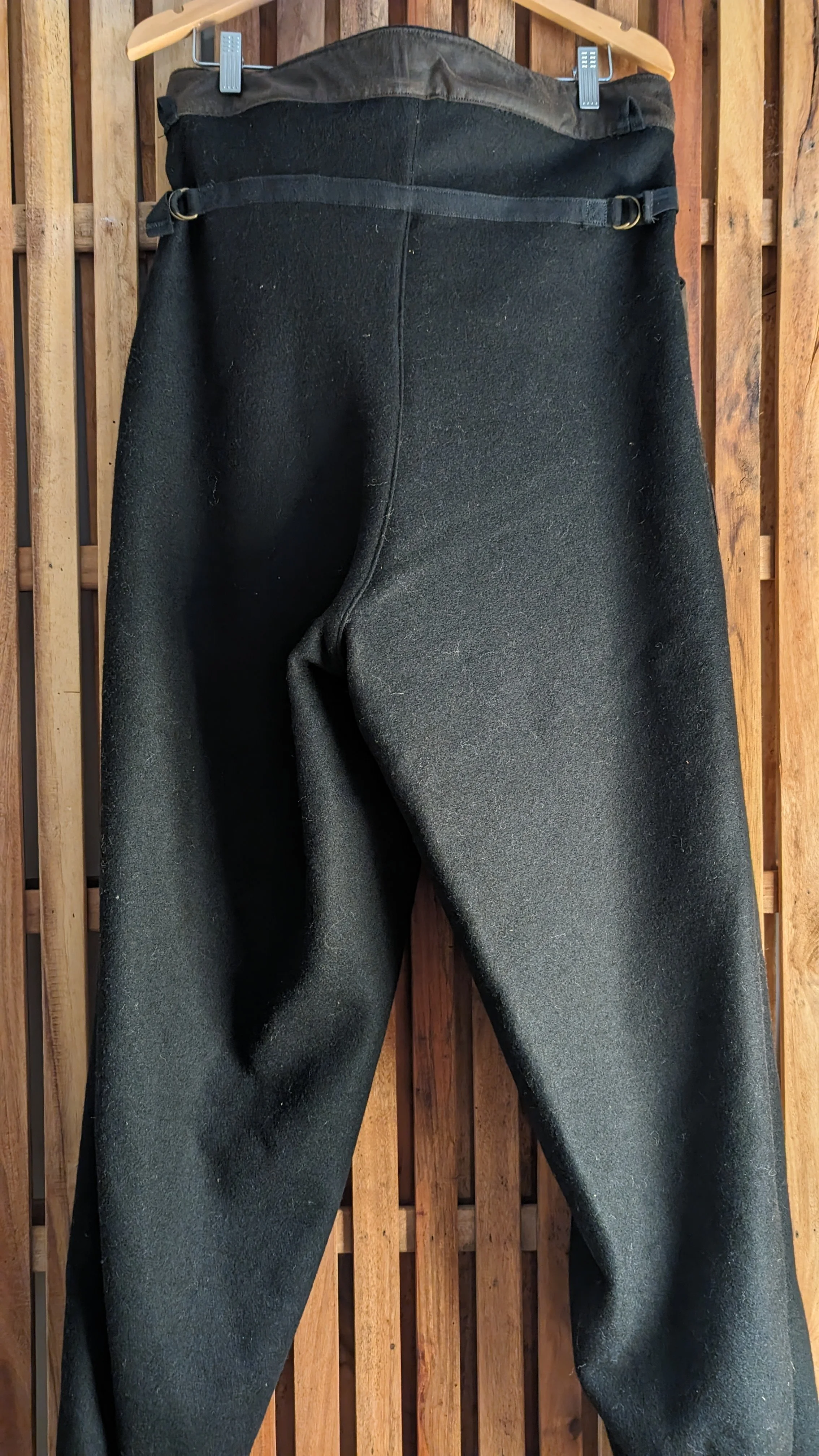 After a few years researching, designing, prototyping and testing, I have finally settled on this design. Using a mid weight 400GSM Melton wool, they have plenty of leg room, high rise crotch, bias cut, wide waist band, built-in hip and ankle clasping and a deep fly opening.